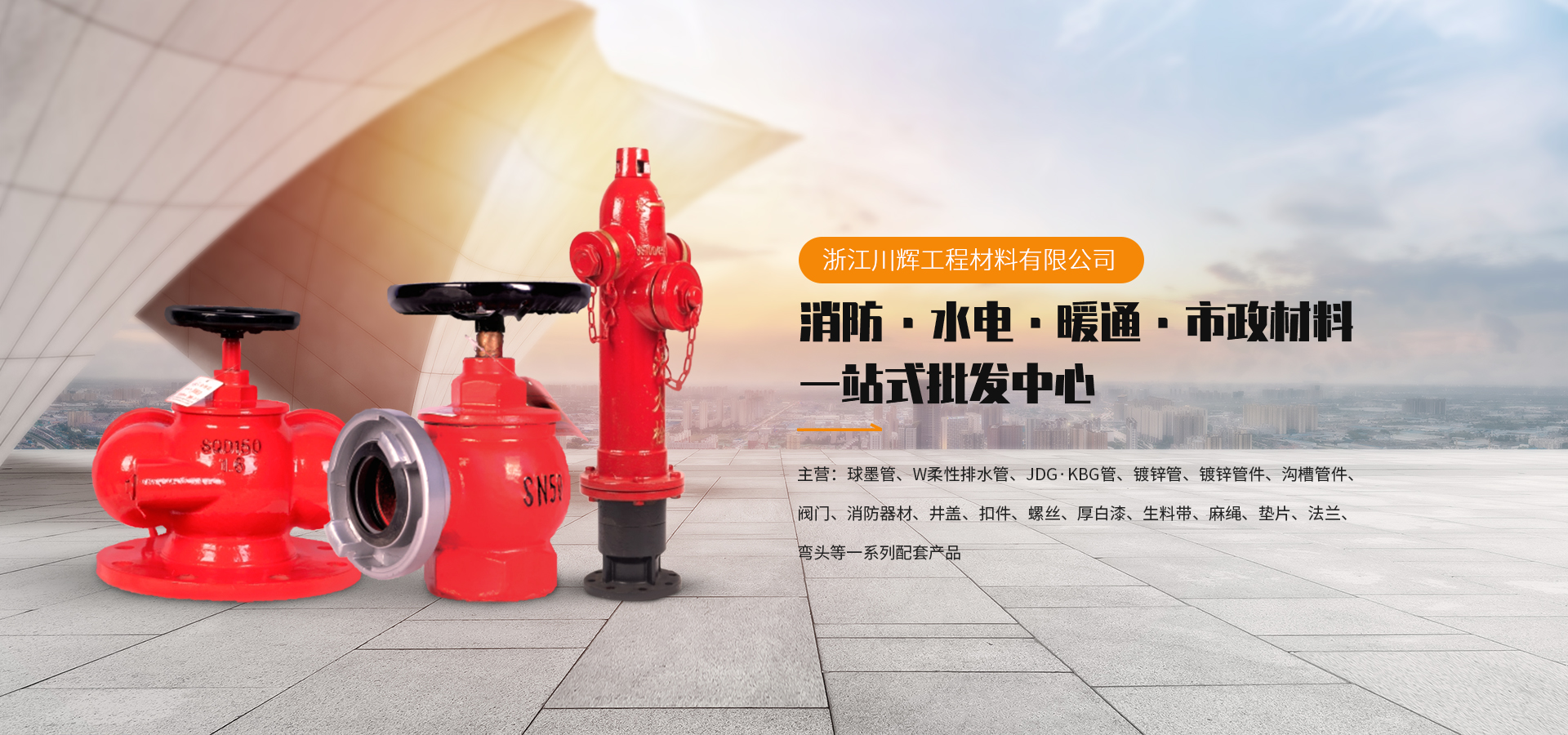 公司主營產品有:球墨管及配件、柔性鑄鐵排水管及配件、KBG、JDG管及配件、鍍鋅管及配件、襯塑管及配件、塗塑管及配件,鋼絲網骨架管及配件、HDPE管及配件、PVC管及配件、浸塑穿線管、消防箱、消火栓、消防器材、閥門、溝槽管件、鍍鋅管件、衝壓彎、法蘭片、銅閥門、井蓋、扣件、電線、電纜、橋架、木托、U型卡、螺絲、螺母、絲杆、套絲機、壓槽機、開孔機、切管機、油漆、麻繩、切割片、電焊條、預埋板、穿線套管等一切配套材料。(代理品牌眾多,歡迎來人來電谘詢)